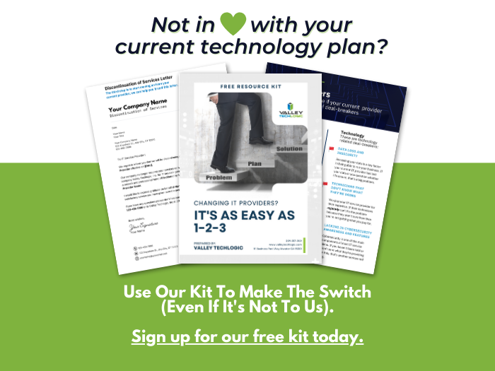 If you’re working with an IT service provider who doesn’t give you the option of meeting annually, it would be our recommendation you look for a new provider. Our Switching IT Provider’s kit makes it easy to switch (we even provide you with a template letter for discontinuing your service) and if you’re looking for an IT service provider who makes meeting with clients regularly a priority, than why not give Valley Techlogic a shot by clicking here or the image below.