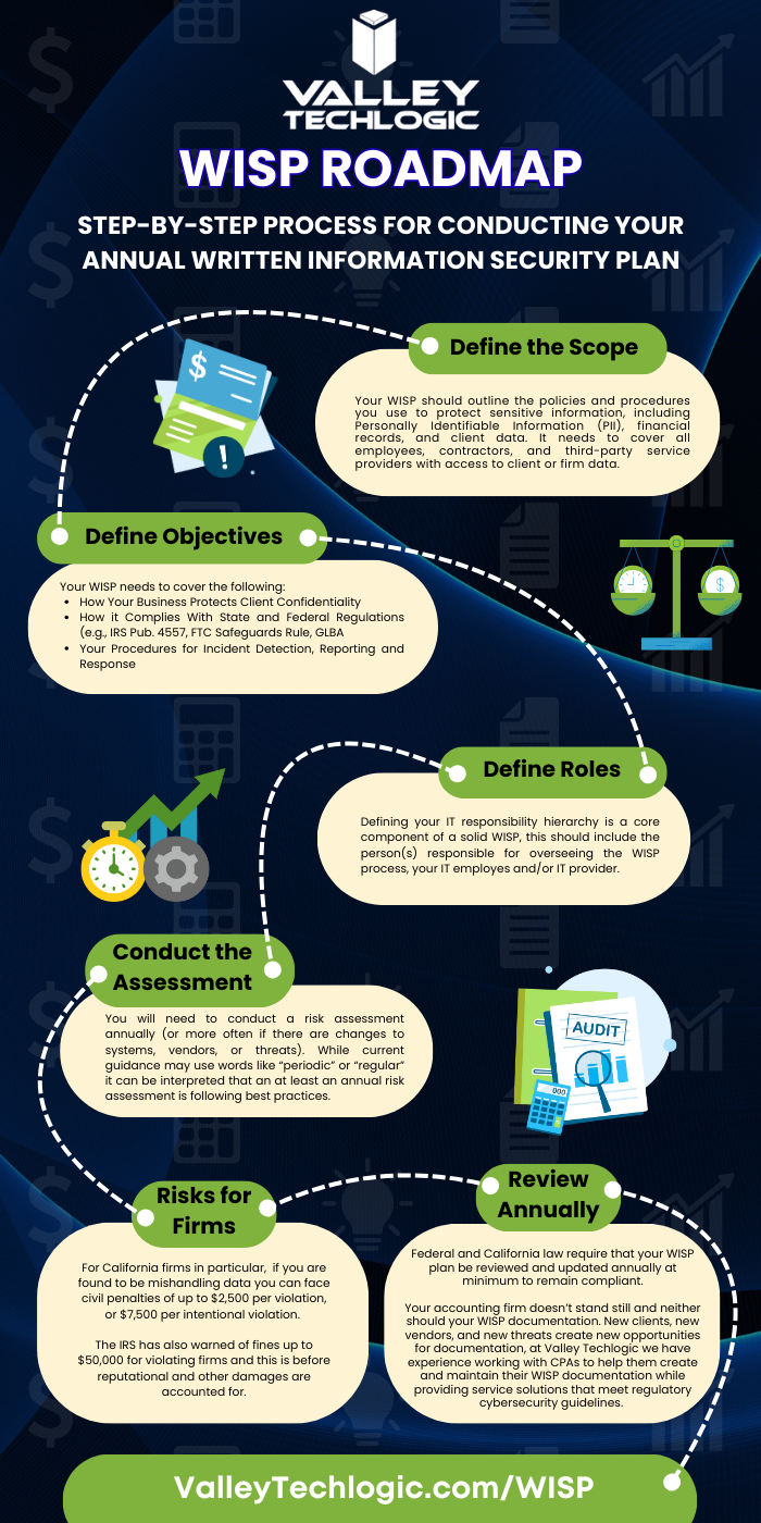 At Valley Techlogic, we know CPA firms and other professional service providers handle highly sensitive data every day — tax records, payroll details, financial statements, and confidential client information. A strong Written Information Security Plan (WISP) isn’t just a compliance requirement; it’s the baseline for protecting your clients, your firm, and your reputation.